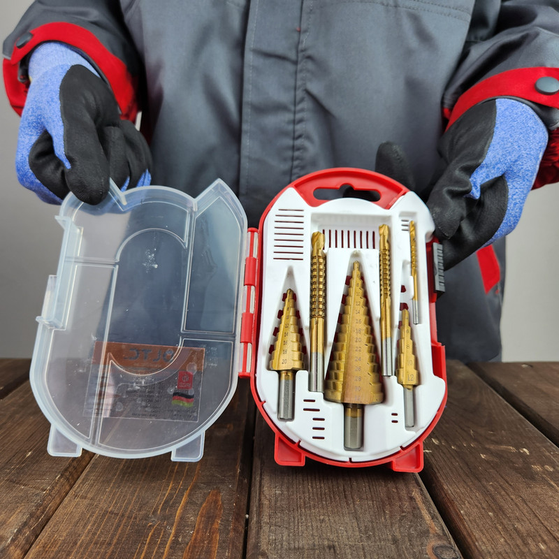 مته پلهای دی ال تی سی جایگزین مناسبی برای سوراخ کاری ورقها به جای متههای معمولی هستند. این مجموعه ساخت چین بوده و از یک جعبه طلقی شیک و محکم برخوردار است. مجموعه فوق شامل 3 عدد مته پلهای در سایزهای 4 تا 12 ، 4 تا 20 و 4 تا 32 در سایزهای زوج است. از طرفی دارای سه عدد مته اره ای به سایزهای 3، 6 و 8 میلیمتر دارد که برای برش از کنار در چوب است در واقع به نوعی کار تیه اور فرز را انجام میدهد. این متهها از جنس فولاد تند بر HSS و از روکش تیتانیوم برخوردار بوده و قابلیت سوراخ کاری روی آهن، برنج، مس، آلومینیوم، چوب و پلاستیک را دارد. البته باید در نظر داشته باشید که عمق هر پله تنها 5 میلیمتر است. پس حتی در نرمترین مواد مانند چوب یا پلاستیک هم نمیتوان بیش از ضخامت 5 میلیمتر را سوراخ کرد. در قطعات سختتر مانند آهن هم حداکثر ضخامت 3 تا 4 میلیمتر پیشنهاد میگردد. و نکته آخر اینکه با به کار بردن آب صابون یا سایر مواد خنک کننده هنگام کار، عمر ابزار را نیز افزایش خواهید داد.
